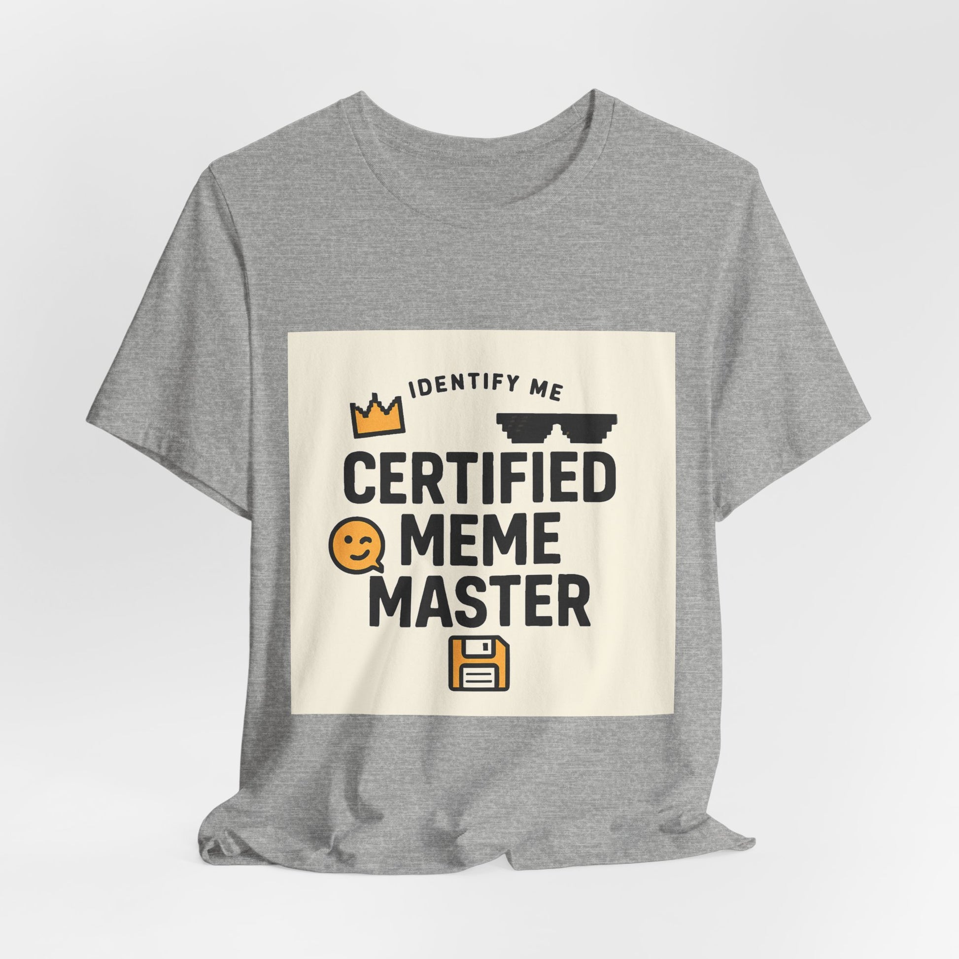 Wear your internet sense of humor loud and proud. This lightweight jersey tee feels like your go-to for scrolling sessions, study breaks, and casual hangouts — soft, breathable cotton with a tidy crew neckline and a slim retail fit that layers well. The playful front print reads “CERTIFIED MEME MASTER” with emoji-style graphics and a vintage floppy-disk icon, giving it a tongue-in-cheek, nostalgic vibe. It settles comfortably against the skin thanks to Airlume combed and ring-spun cotton, with side seams and shoulder tape that keep the shape through repeat wears. The printed label and sleeves use crisp DTF/DTG methods so the design stays sharp, and a tear-away label prevents irritation. Responsibly made on Bella+Canvas blanks with REACH certification and ethical production standards.